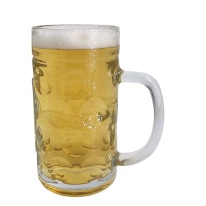 Vaso de vidrio grueso, diseñado para mantener la cerveza fresca y fría por más tiempo. Su boca ancha permite apreciar la espuma y facilita beber cómodamente, mientras que el asa evita calentar la cerveza con la mano.