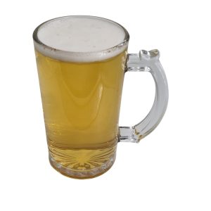 Vaso de vidrio grueso, diseñado para mantener la cerveza fresca y fría por más tiempo. Su boca ancha permite apreciar la espuma y facilita beber cómodamente, mientras que el asa evita calentar la cerveza con la mano.